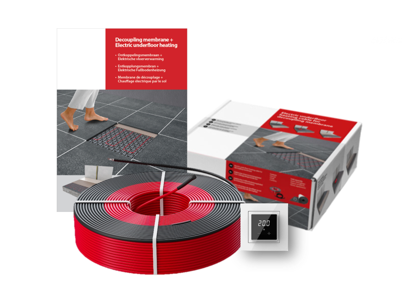 De verwarmingskabel wordt bij installatie bevestigd op een ontkoppelingsmat (met een lusafstand van 7,5 cm of 10 cm). De isolatie van deze kabel is gemaakt van FEP (temperatuur-bestendig kunststof) en de beschermmantel is van PVC, waardoor de verwarmingskabel zeer duurzaam en 100% waterdicht is.
