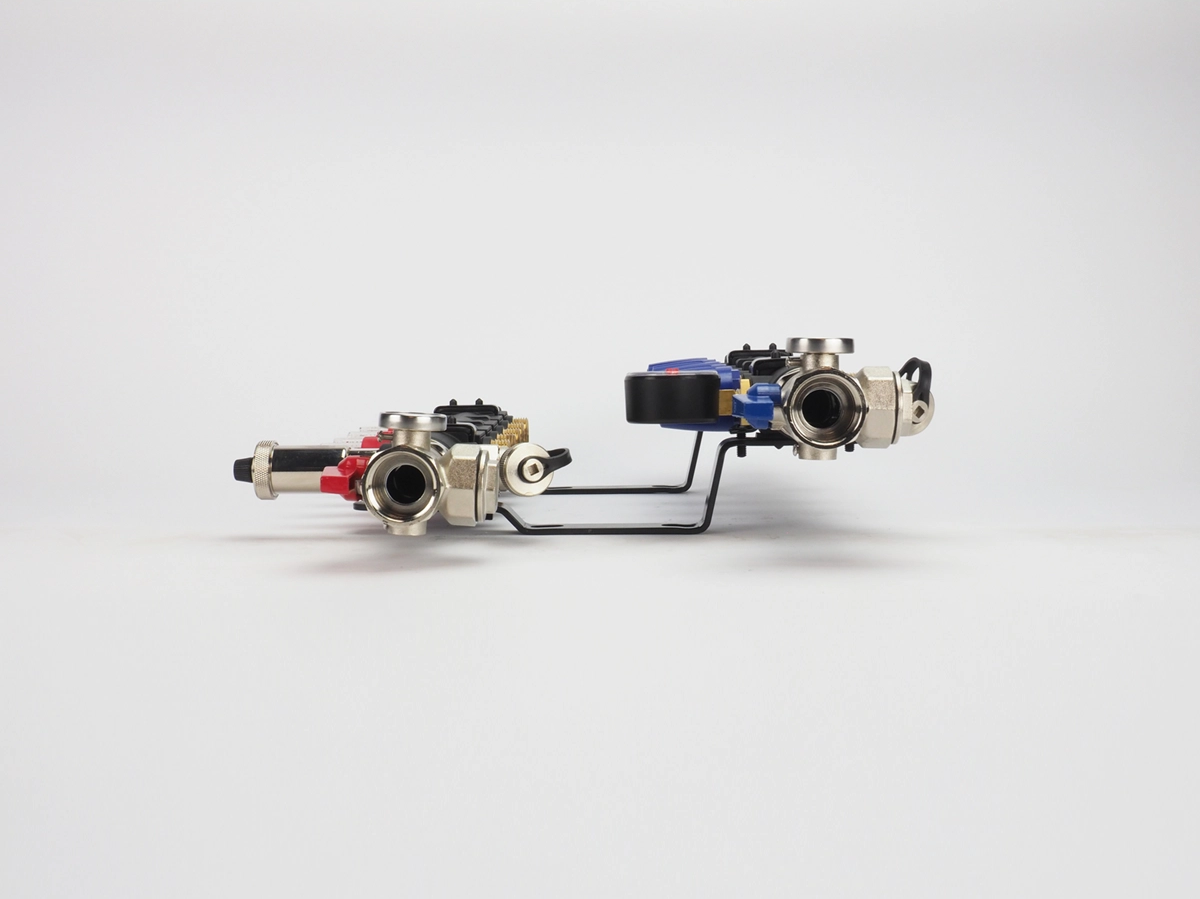 vul-/aftapkraan aanvoer met kogelafsluiter, 1" thermometer aanvoer automatische ontluchter inregelbare flowmeter aanvoer vloerverwarmingsbuizen retour met kogelafsluiter, 1" thermometer retour vul-/aftapkraan manometer thermostatische afsluiter met M30 draad retour vloerverwarmingsbuizen |