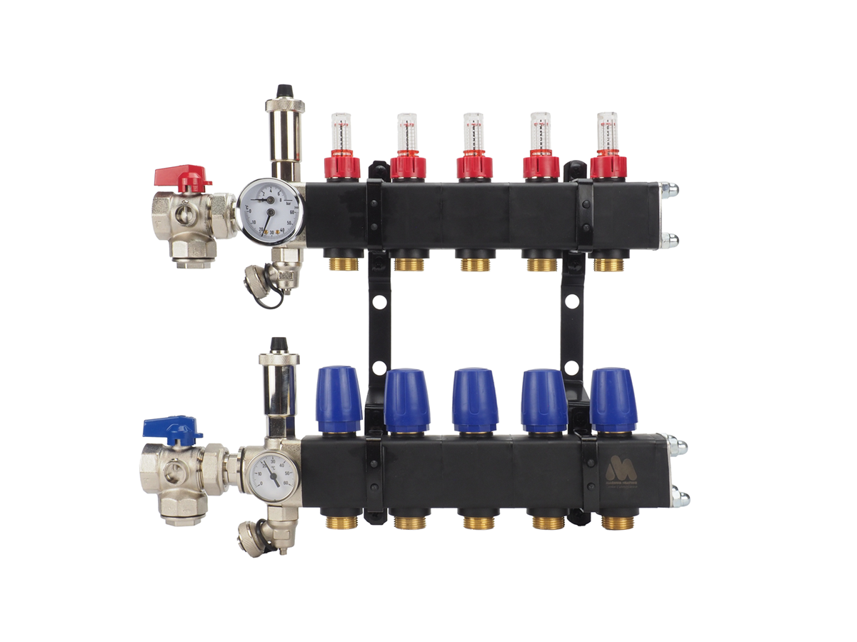 vul-/aftapkraan aanvoer met kogelafsluiter, 1" thermo-/manometer aanvoer automatische ontluchter inregelbare flowmeter aanvoer vloerverwarmingsbuizen retour met kogelafsluiter, 1" automatische ontluchter vul-/aftapkraan thermometer retour thermostatische afsluiter met M30 draad retour vloerverwarmingsbuizen |