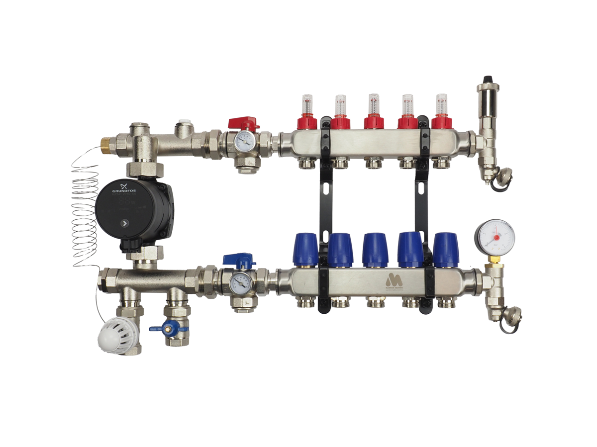 De open RVS collector bestaat uit roestvast stalen modules uit één geheel, die door middel van ophangbeugels aan de wand gemonteerd worden. Deze verdeelunit is geschikt voor laagtemperatuursystemen en voorzien van inregelbare flowmeters waarmee de doorstroom van water per groep ingeregeld kan worden. De verdeler kan geschikt gemaakt worden voor hoogtemperatuursystemen met behulp van de meegeleverde mengunit met circulatiepomp.