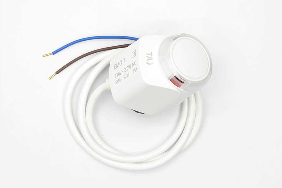 Deze servomotoren zijn 230V aan/uit thermomotortjes die gebruikt worden voor het automatisch bedienen van elk van de afsluitkranen. Wanneer de motoren op de kranen worden gemonteerd, sluiten ze automatisch de watertoevoer vanaf de warmtebron af ("normaal gesloten" versie / NC). Zodra er een warmtevraag van het vloerverwarmingssysteem is, zorgt de thermostaat, die in verbinding staat met de vloerverwarmingsregelaar, dat de motoren de afsluitkranen openen zodat warm water van de warmtebron de verdeler ingelaten kan worden. Wanneer de juiste temperatuur bereikt is, sluiten de servomotoren de afsluitkranen weer. |