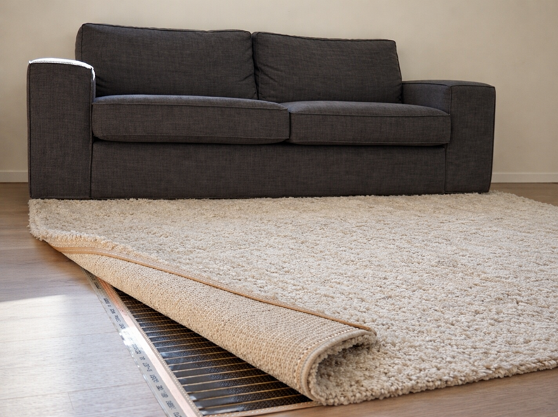 Door de minimale opbouwhoogte van 0,38mm kan de verwarmer direct onder het vloerkleed worden geplaatst, maar wel dient deze op een vlakke ondergrond te worden aangebracht. Om te voorkomen dat er beschadigingen ontstaan aan de infrarood verwarmingsfolie of vloerafwerking wordt gebruik van een temperatuurbestendig ondertapijt echter wel aangeraden.